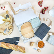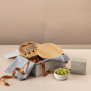 At the heart of this bundle is a round timber cheese board, featuring a cleverly concealed set of cheese knives, making slicing and serving a seamless experience. Paired with a ceramic fluted dip bowl, this set ensures dips, olives, or condiments are served with sophistication. Completing the collection is a waffle cotton tea towel, a chic and practical touch that adds understated luxury to any kitchen.