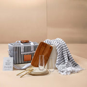 At the heart of the bundle is a bold charcoal-striped cooler bag with vegan leather trim—both eye-catching and functional. Paired with a matching Turkish towel, it brings a polished touch to laid-back outdoor lounging. The Acacia wooden cheese board adds a natural element of sophistication, while the gold-finish cheese knives elevate the setup even further.