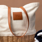 Canvas drawstring basket tote bag with leatherette handles - option to add a branded leather patch with your logo