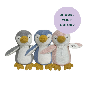 For tiny toes, the baby socks feature adorable rattle toes, adding a gentle jingle with every little kick. Playtime is made extra special with a knitted penguin crinkle and rattle toy, available in your choice of grey, pink or blue. To soothe sore gums, the silicone teether ring in a matching colour is both safe and easy for little hands to hold.