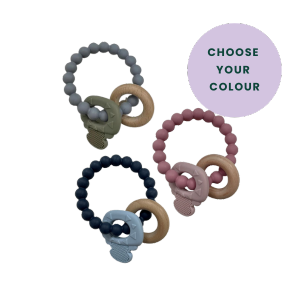 Silicone teether ring in grey, pink or blue