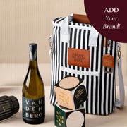 At the centre is a bold charcoal-striped cooler bag, featuring vegan leather trim and ample room to keep drinks cool on the move. Designed to be used long after the holiday season, the cooler is both practical and elegant — and offers the option to add your company logo to a leather patch for a personal touch.