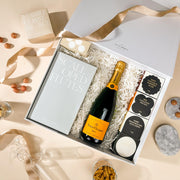 At the heart of the hamper is a premium bottle of Veuve Clicquot Champagne—a refined way to say thank you or celebrate success. The set includes two scalloped Champagne flutes, adding a touch of French-inspired glamour to every toast.